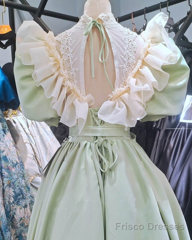 80S Style Puffy Sleeve Lace High Neck Midi Dress