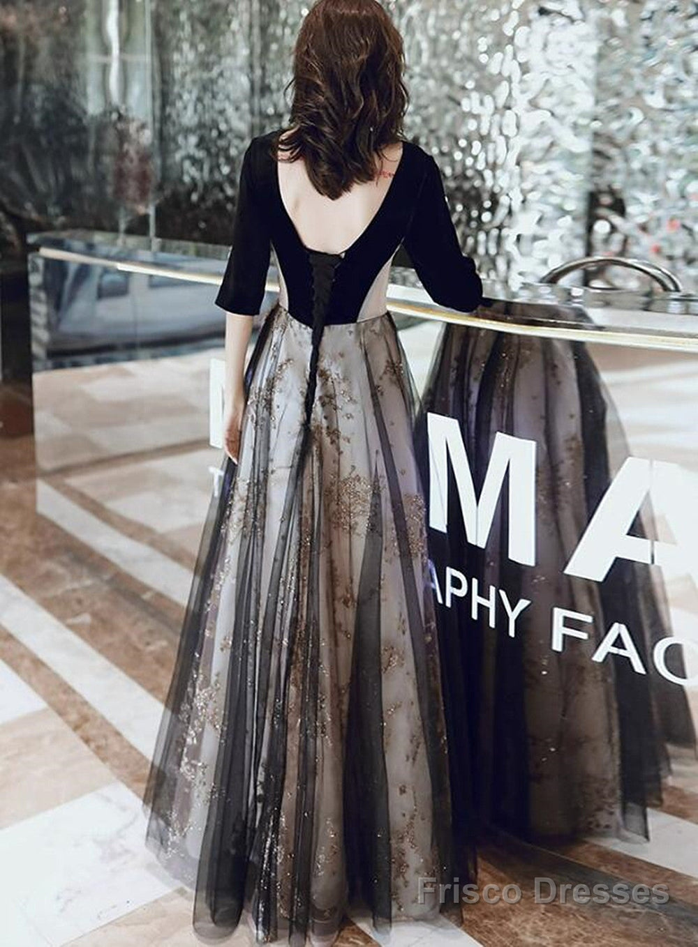 A-Line Black Tulle And Velvet Long Party Dress, Black Prom Dress With Lace Applique