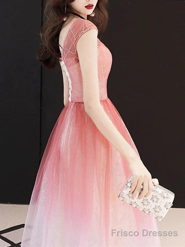 A-Line Bridesmaid Dress Jewel Neck Short Sleeve Color Block Floor Length Tulle With Sequin