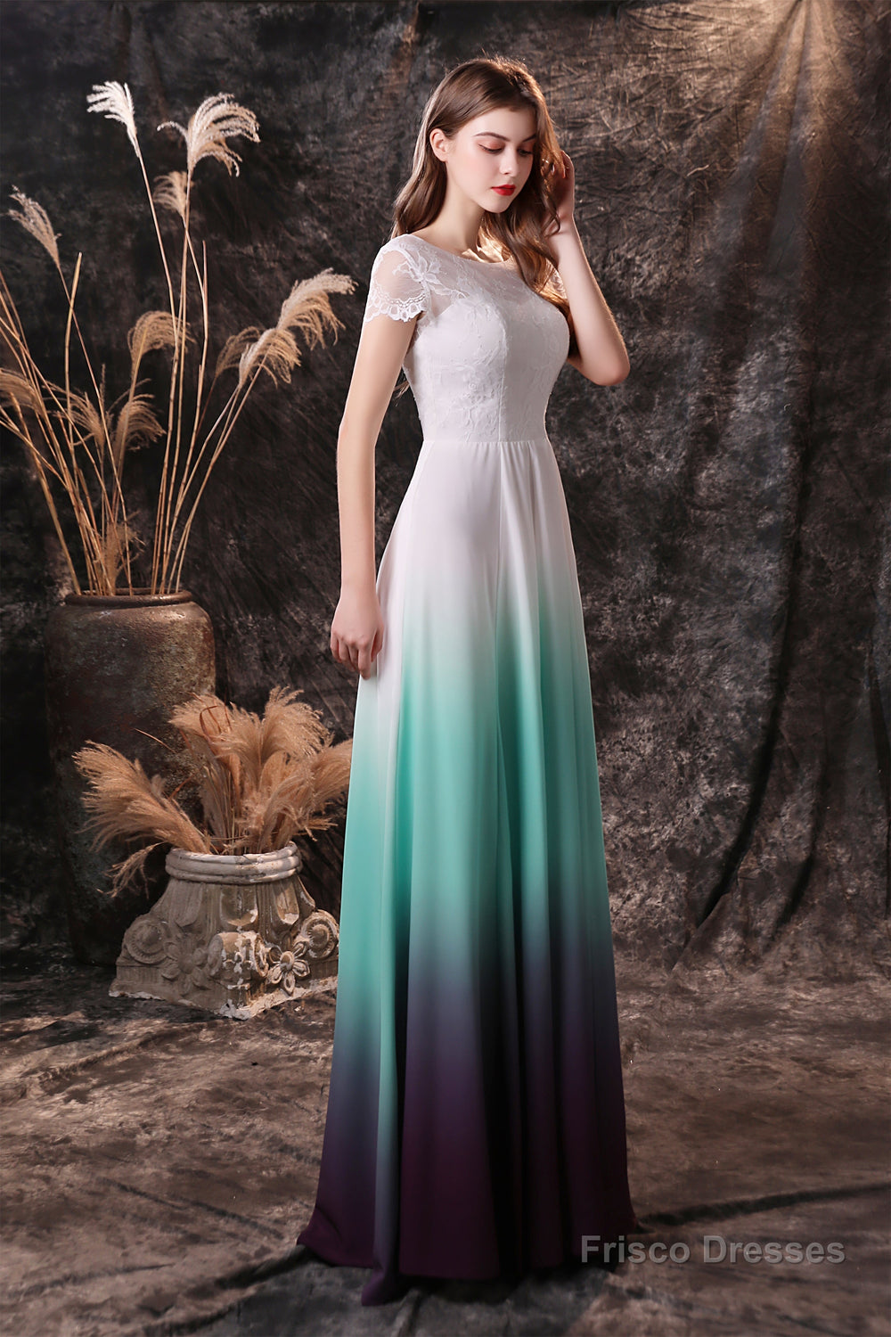 A Line Cap Sleeve Ombre Silk Floor Length Prom Dresses