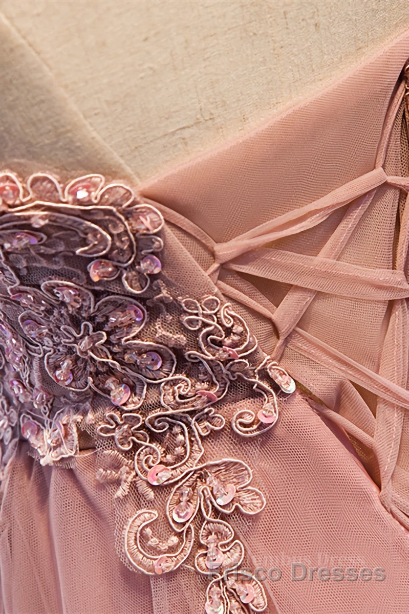 A-line Deep V Neck Beaded Appliques Multi-Layers Hi-Low Formal Dresses