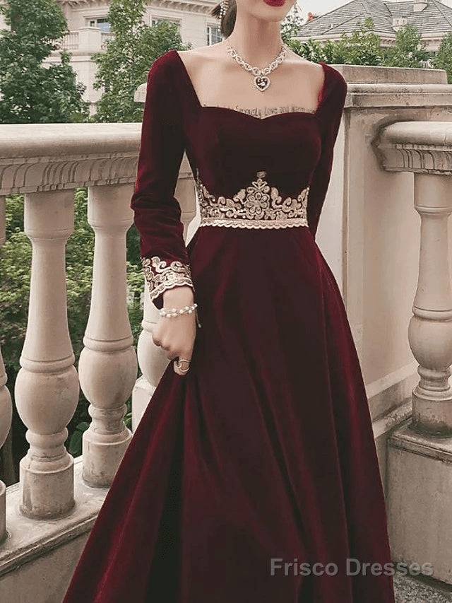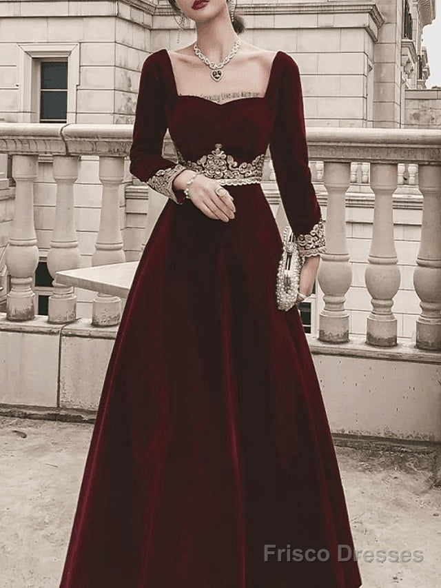 A-Line Elegant Vintage Wedding Guest Formal Evening ValentineS Day Dress Scoop Neck Long Sleeve Floor Length Velvet With Appliques