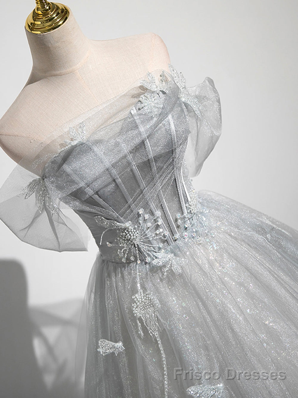 A-Line Off the Shoulder Sparkly Prom Dress, Gray Tulle Corset Floor Length Evening Dress