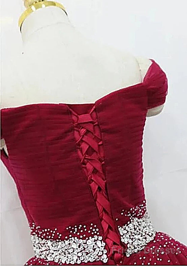 A Line Off The Shoulder Tulle Purple Prom Dresses With Beaded