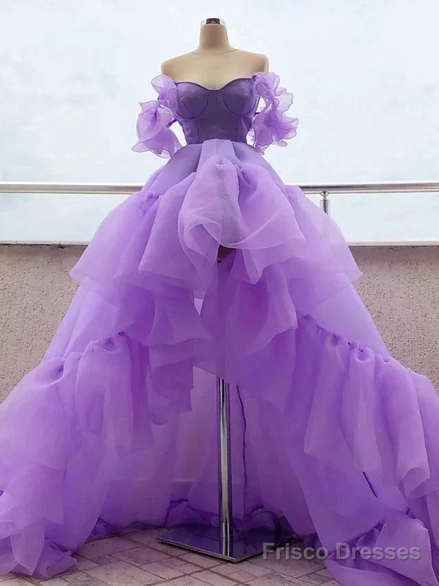 A-Line Prom Dresses High Low Dress Quinceanera Asymmetrical Purple Short Sleeve Off Shoulder Tulle With Tier