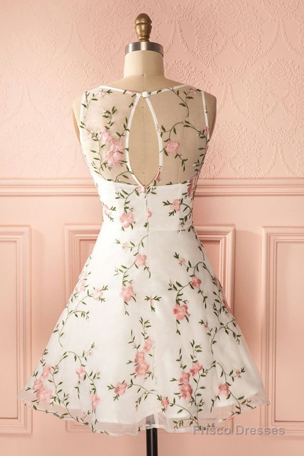 A Line Round Neck Floral Lace White Short Lace Appliques White White Homecoming Dresses