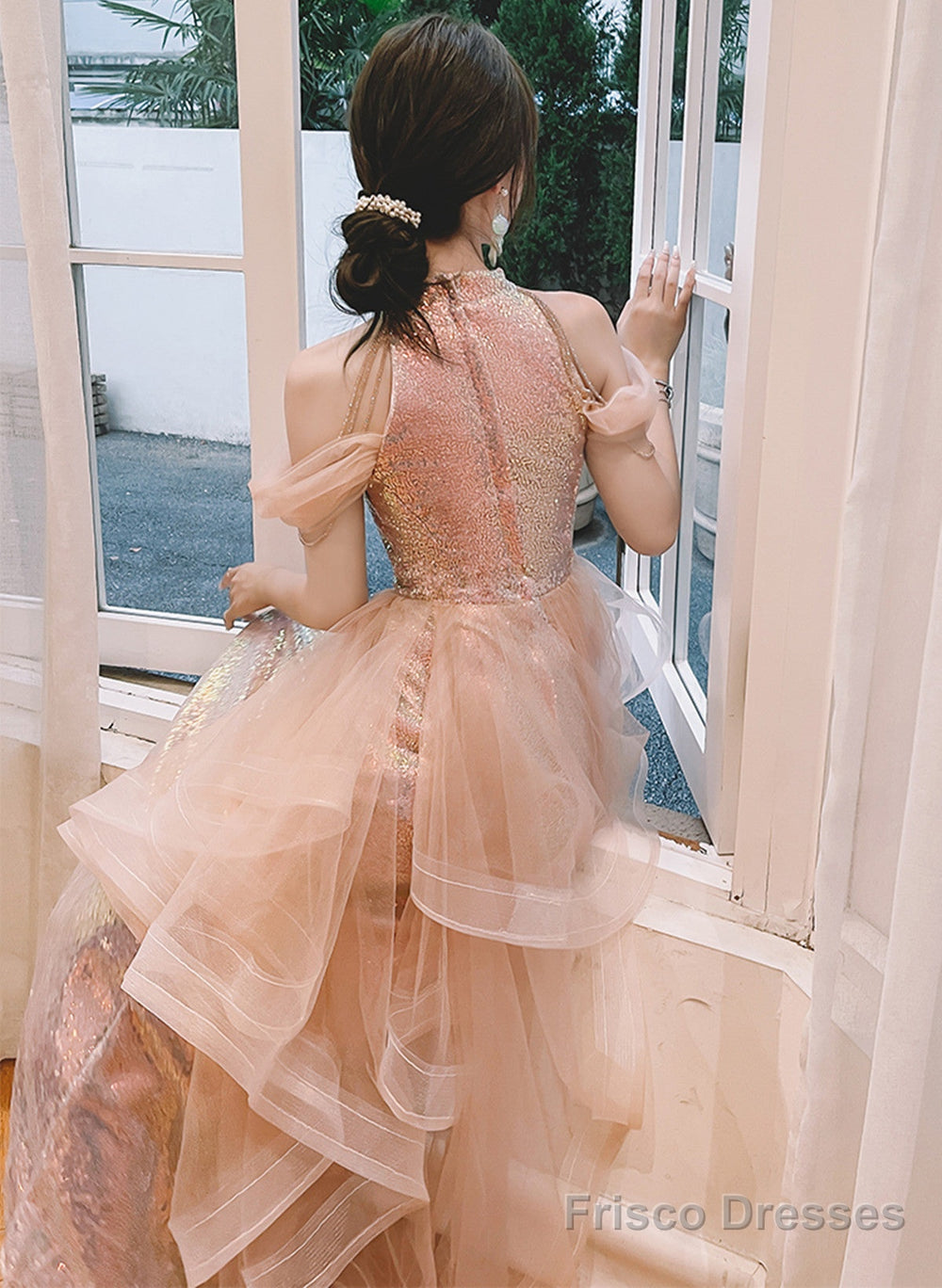 A-Line Sequins And Tulle Pink Long Evening Dress, Pink Tulle Prom Dress