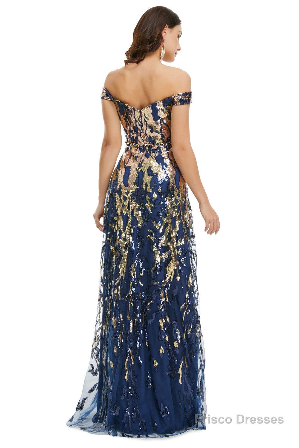 A Line Sequins Off the Shoulder Long Prom Dresses