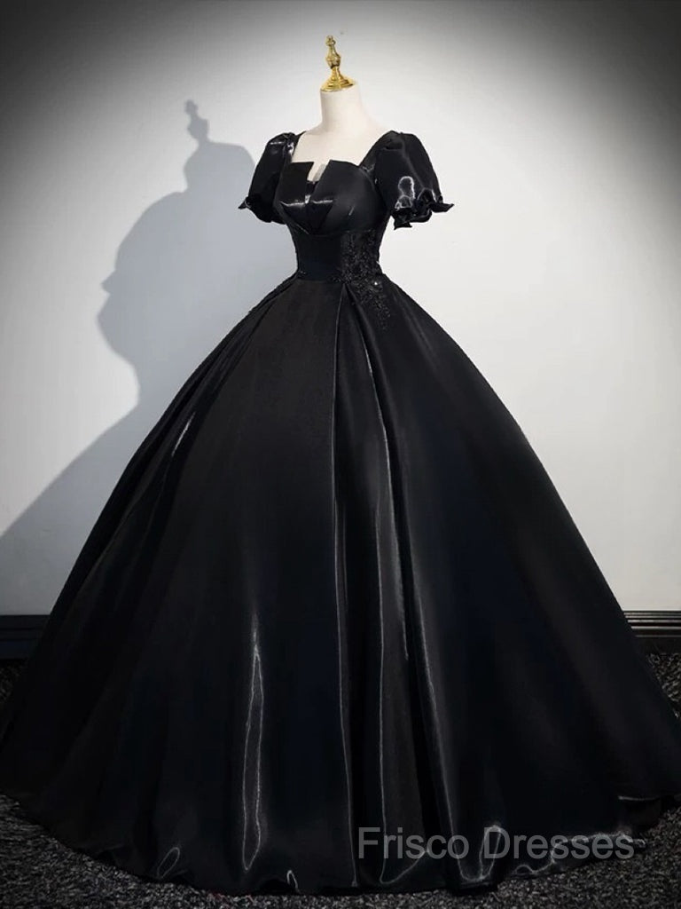 A-Line Short Sleeve Black Satin Long Formal Prom Dress, Black Long Formal Dress