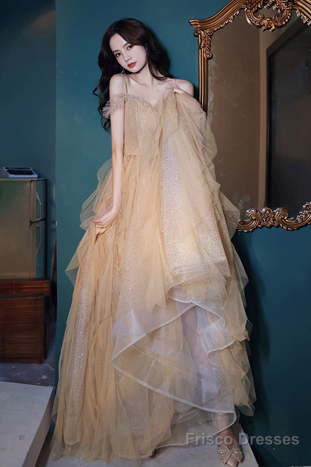 A-Line Tulle Long Prom Dress With Sequins, Spaghetti Straps Evening Dress