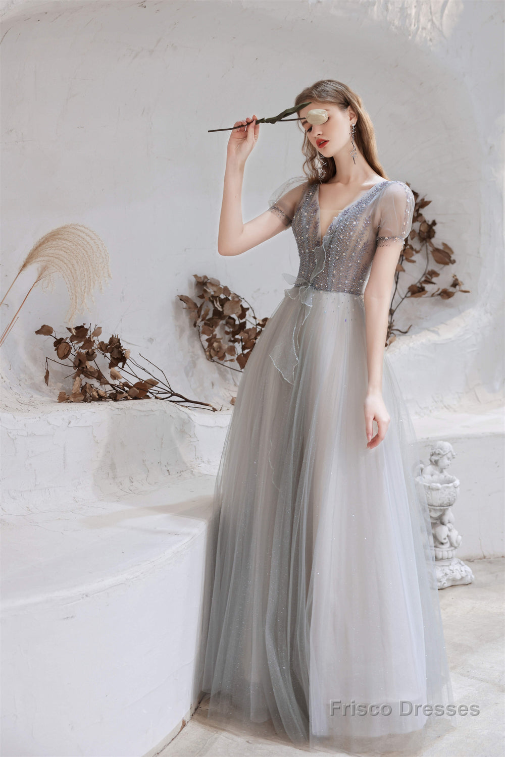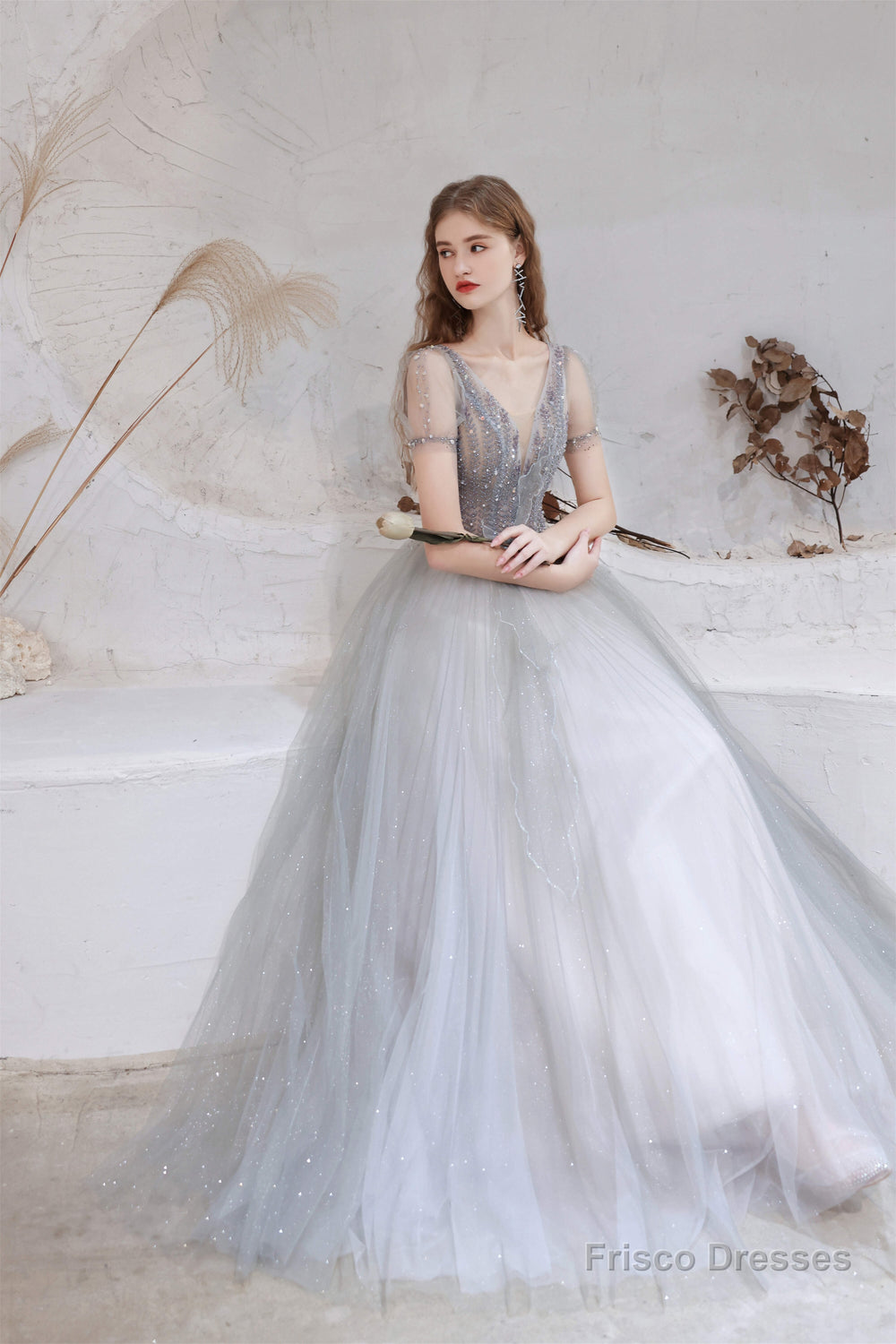 A Line V-Neck Beaded Floor Length Prom Dresses With Short Sleeves