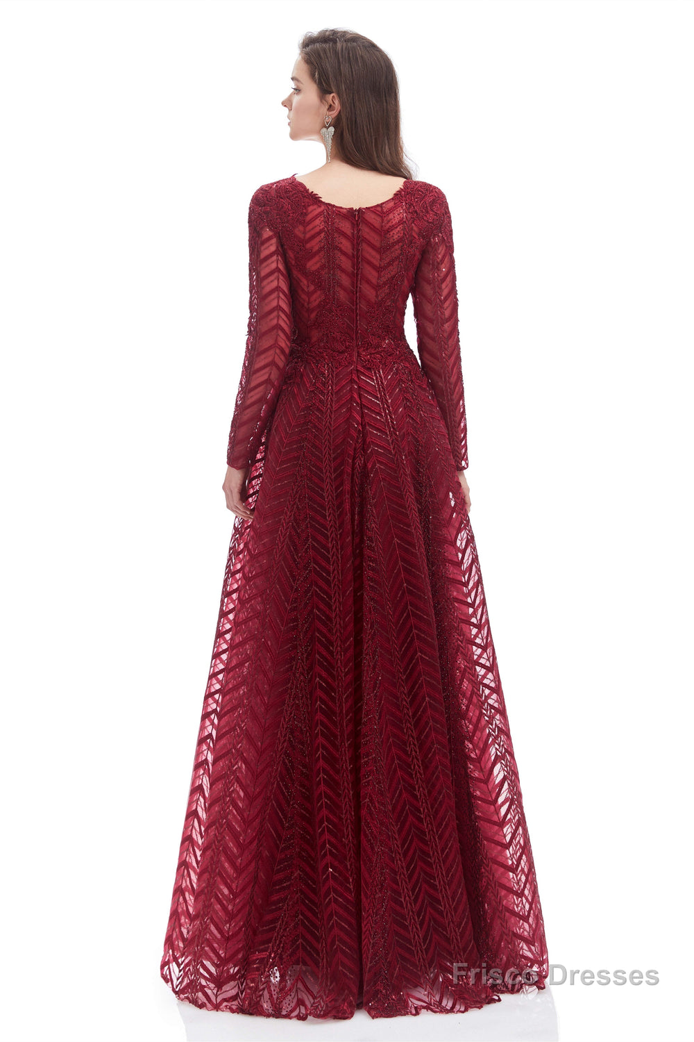 A-Line V Neck Long Sleeves Lace Long Prom Dresses