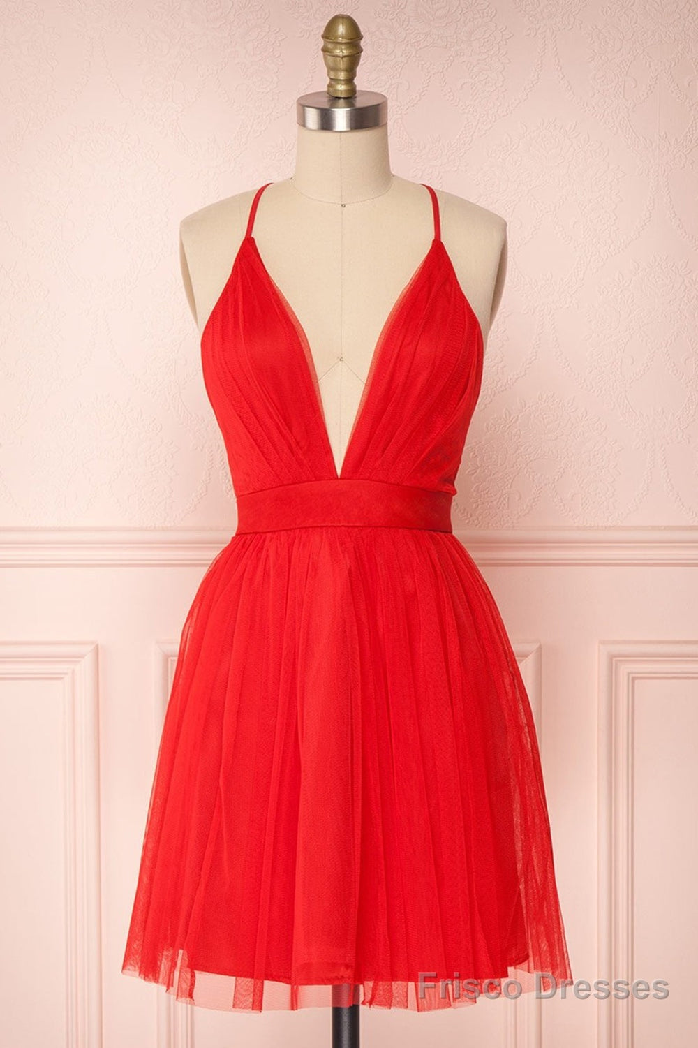 A Line V Neck Short Red/Burgundy Tulle Prom Dresses, Short Red/Burgundy Graduation Homecoming Dresses