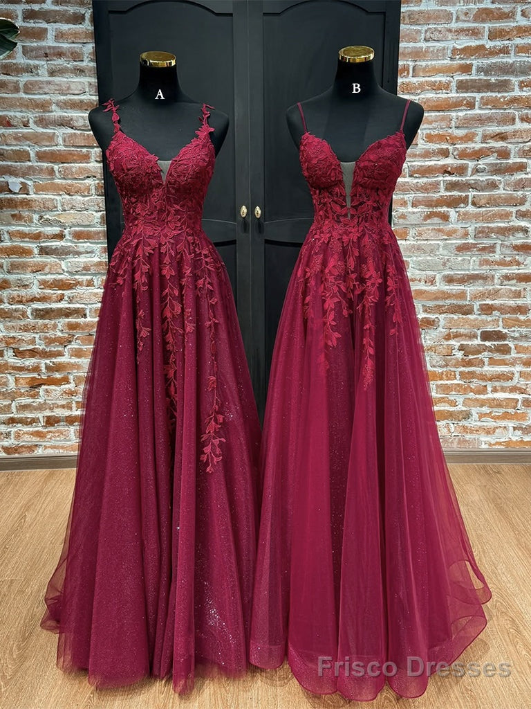 A-Line V Neck Tulle Lace Burgundy Long Prom Dress, Burgundy Long Evening Dress