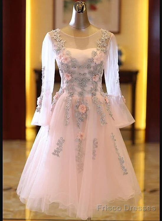 Adorable Pink Tulle Knee Length Long Sleeves Party Dress, Pink Homecoming Dress