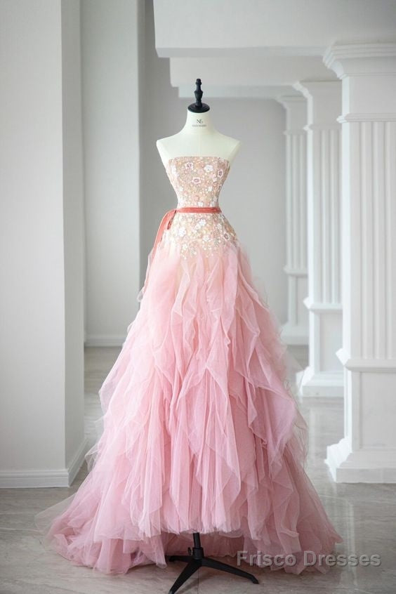 Ball Gown Strapless Tulle Long Pink Prom Dress Evening Dresses