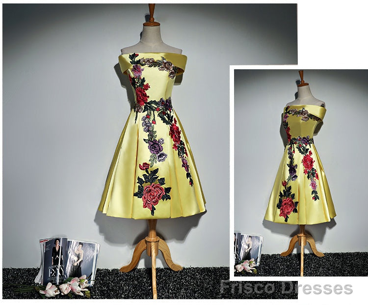 Beautiful Satin Short Flower Off Shoulder Bridesmaid Dress, Cute Homecoming Dress