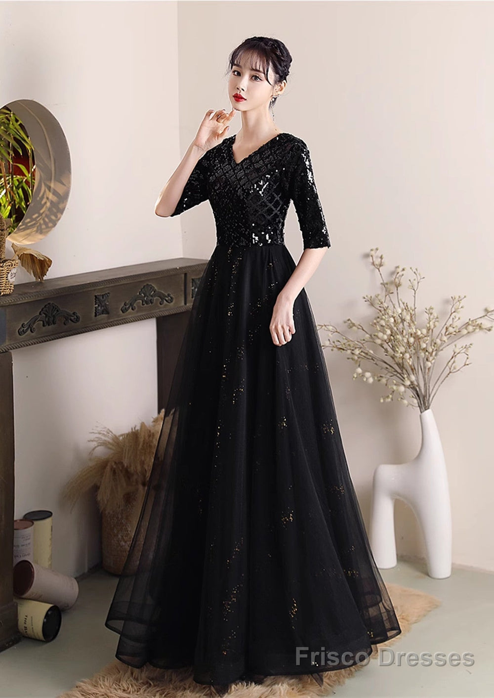 Black A-Line Sequins And Tulle Long Formal Dress, Black Wedding Party Dress