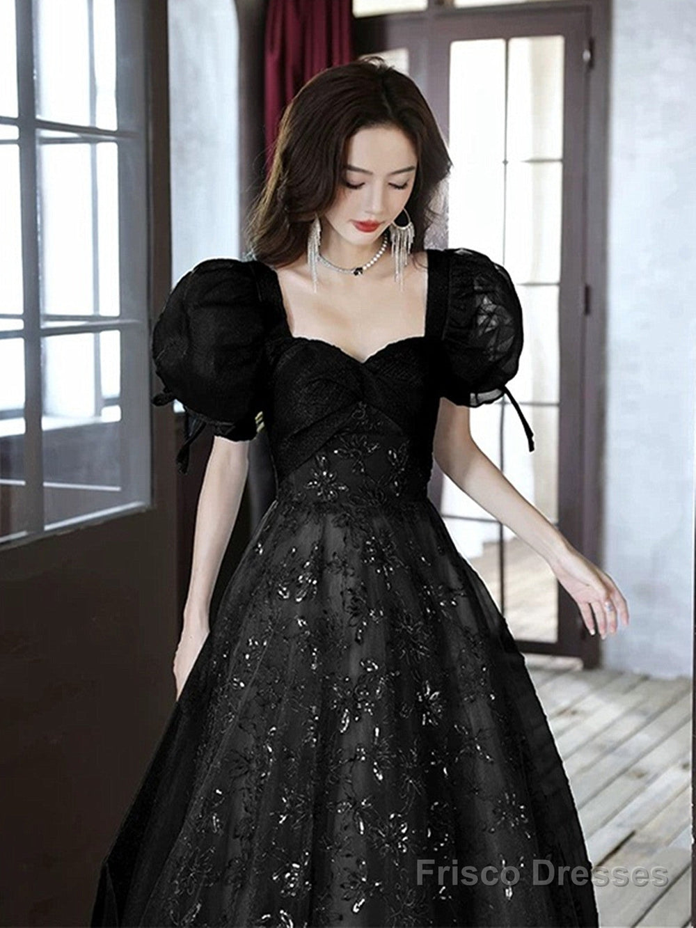 Black A-Line Short Sleeves Lace Floor Length Party Dress, Black Sweetheart Prom Dress