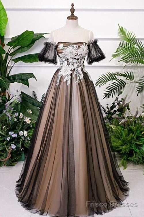 Black And Champagne Short Sleeves Tulle With Lace Party Dress, A-Line Floor Length Prom Dress