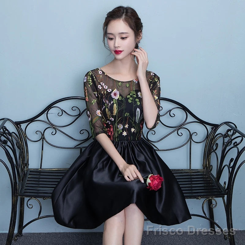 Black Floral Lace Short Sleeves Homeocming Dress, Back Party Dress Wedding Party Dress