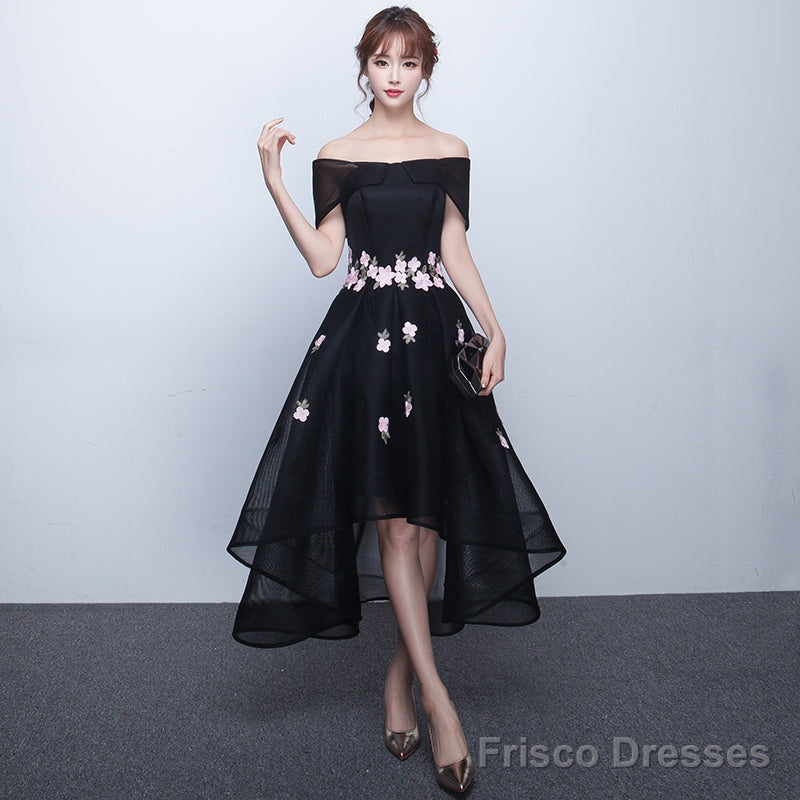 Black Off Shoulder High Low Party Dresses With Flower Lace, Black Short Homecoming Dresses