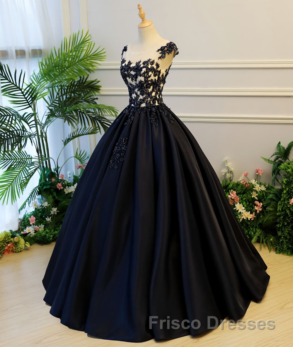 Black round neck satin long Formal Prom gown, black evening Dresses