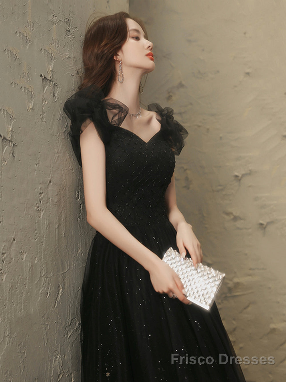 Black Tulle Beaded Long Prom Dress, Short Sleeve Evening Party Dress