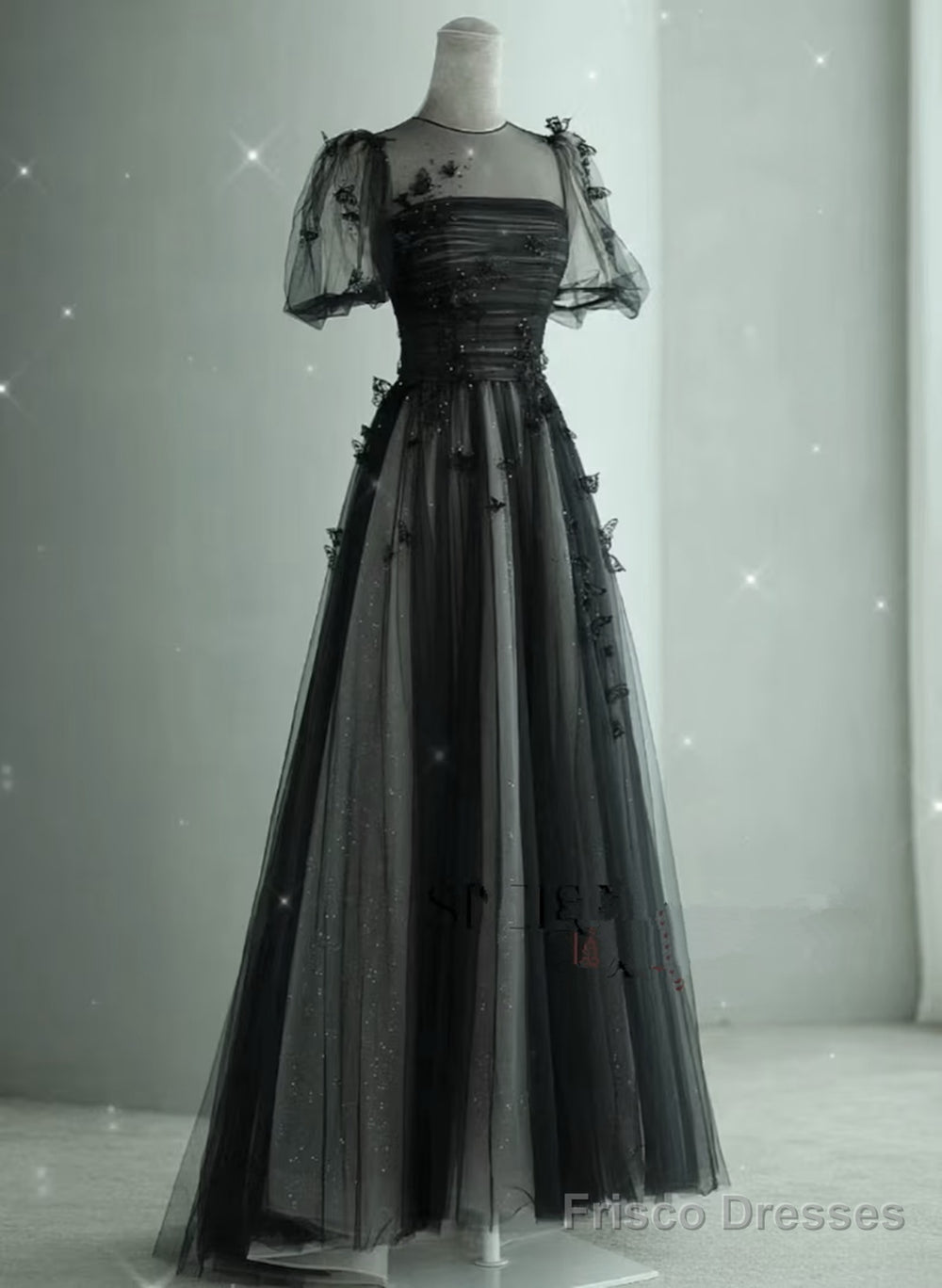 Black Tulle Puffy Short Sleeves A-Line Prom Dress, Black Evening Dress Party Dress