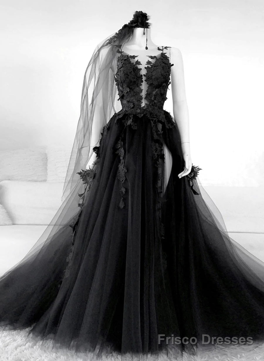 Black V-Neckline Backless Tulle With Lace Party Dress, Black Long Prom Dress