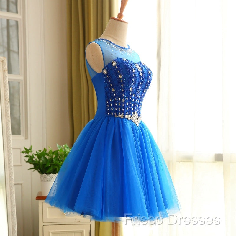 Blue Beaded Tulle Short Cute Homecoming Dress, Blue Short Party Dress Formal Prom Dress