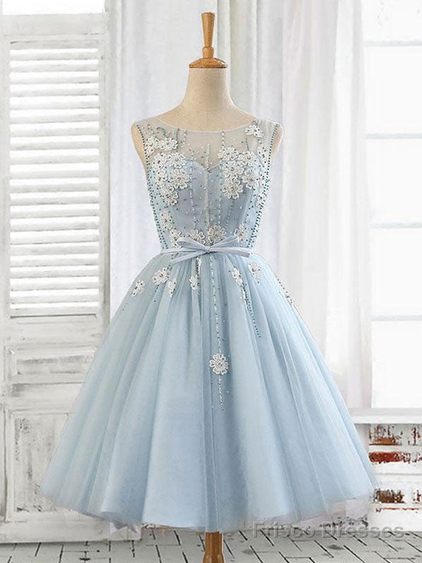 Blue Round Neck Tulle Beads Tulle Short Prom Dress, Blue Homecoming Dress