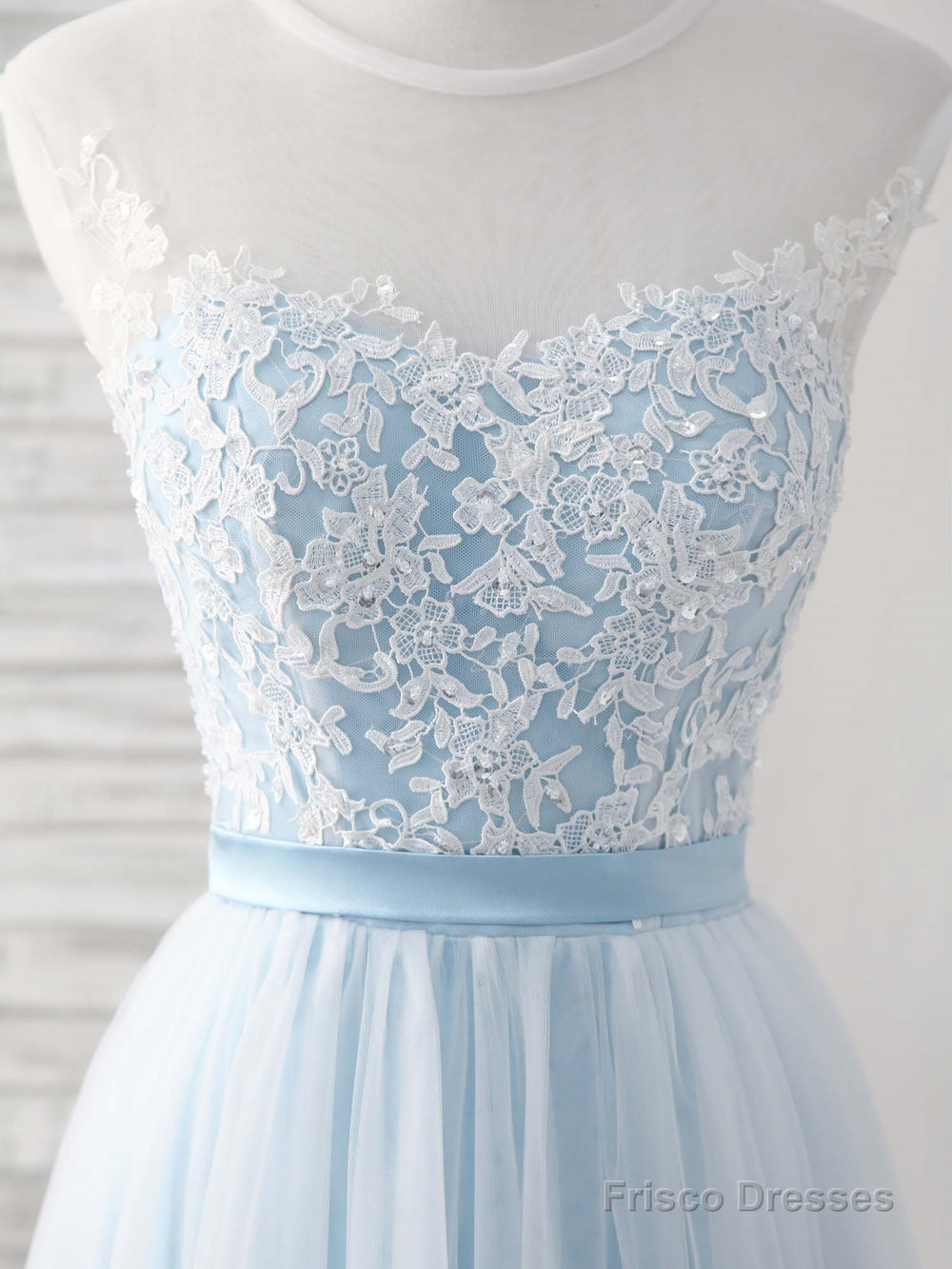 Blue Round Neck Tulle Lace Applique Long Prom Dresses