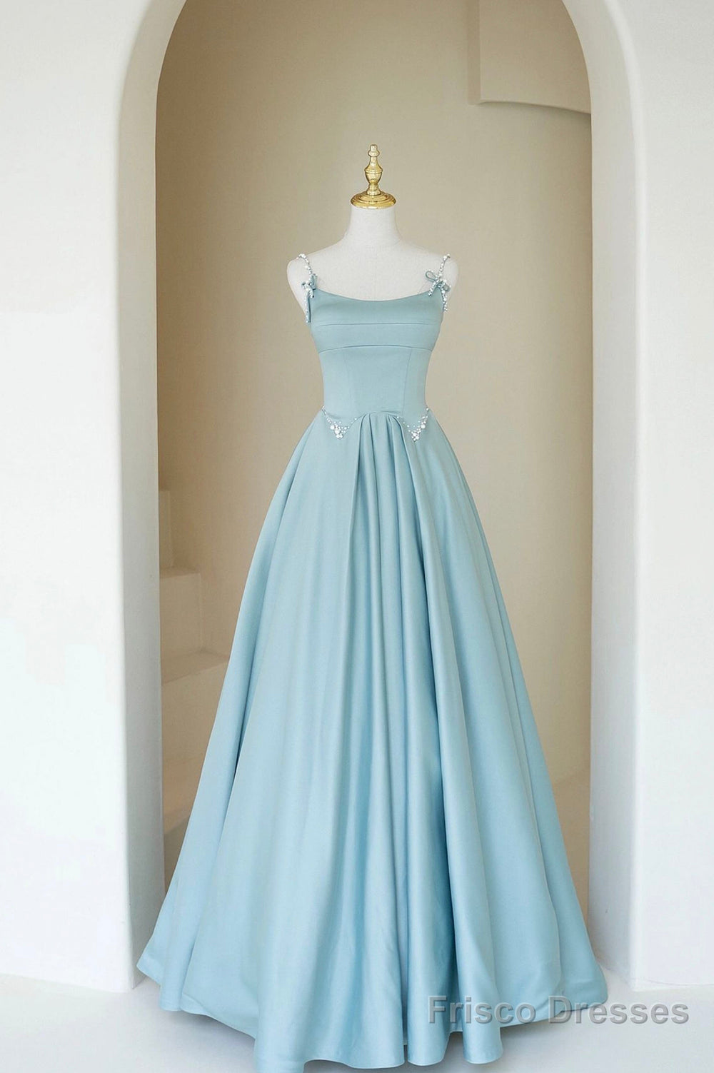 Blue Satin Long A-Line Prom Dress, Beautiful Spaghetti Straps Evening Dress