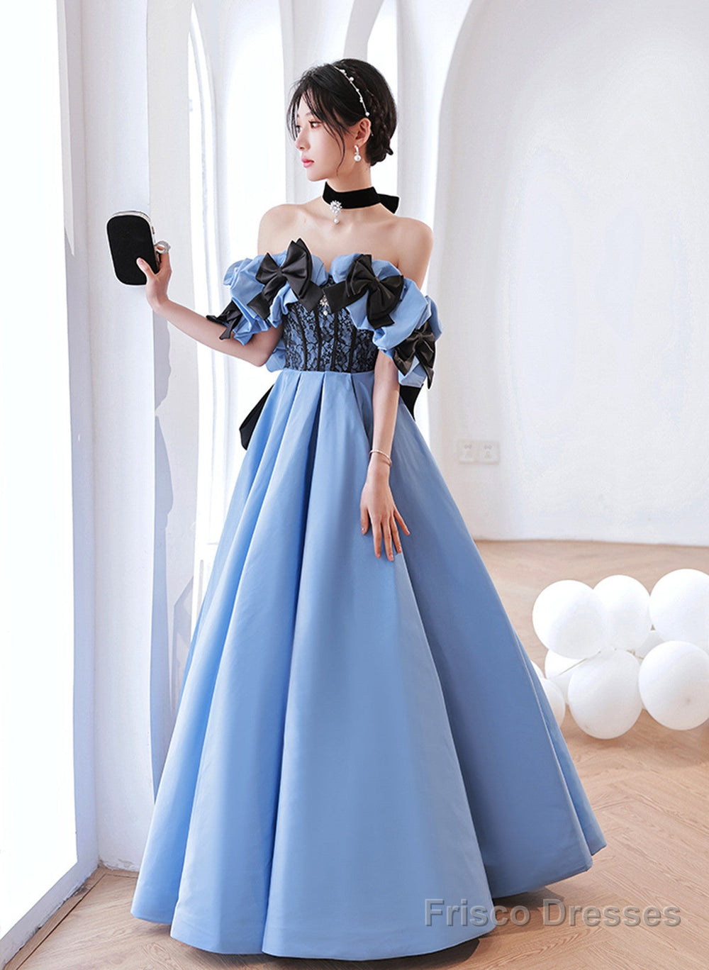 Blue Satin Off Shoulder Black Lace Long Party Dress, A-Line Blue Prom Dress Evening Dress