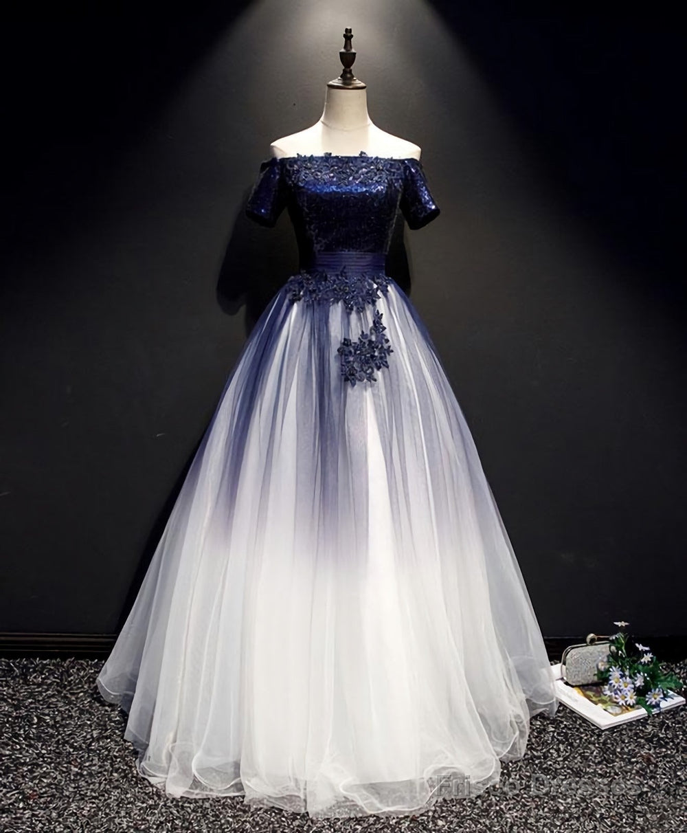 Blue Tulle Lace Long Prom Dress, Blue Tulle Lace Formal Dress