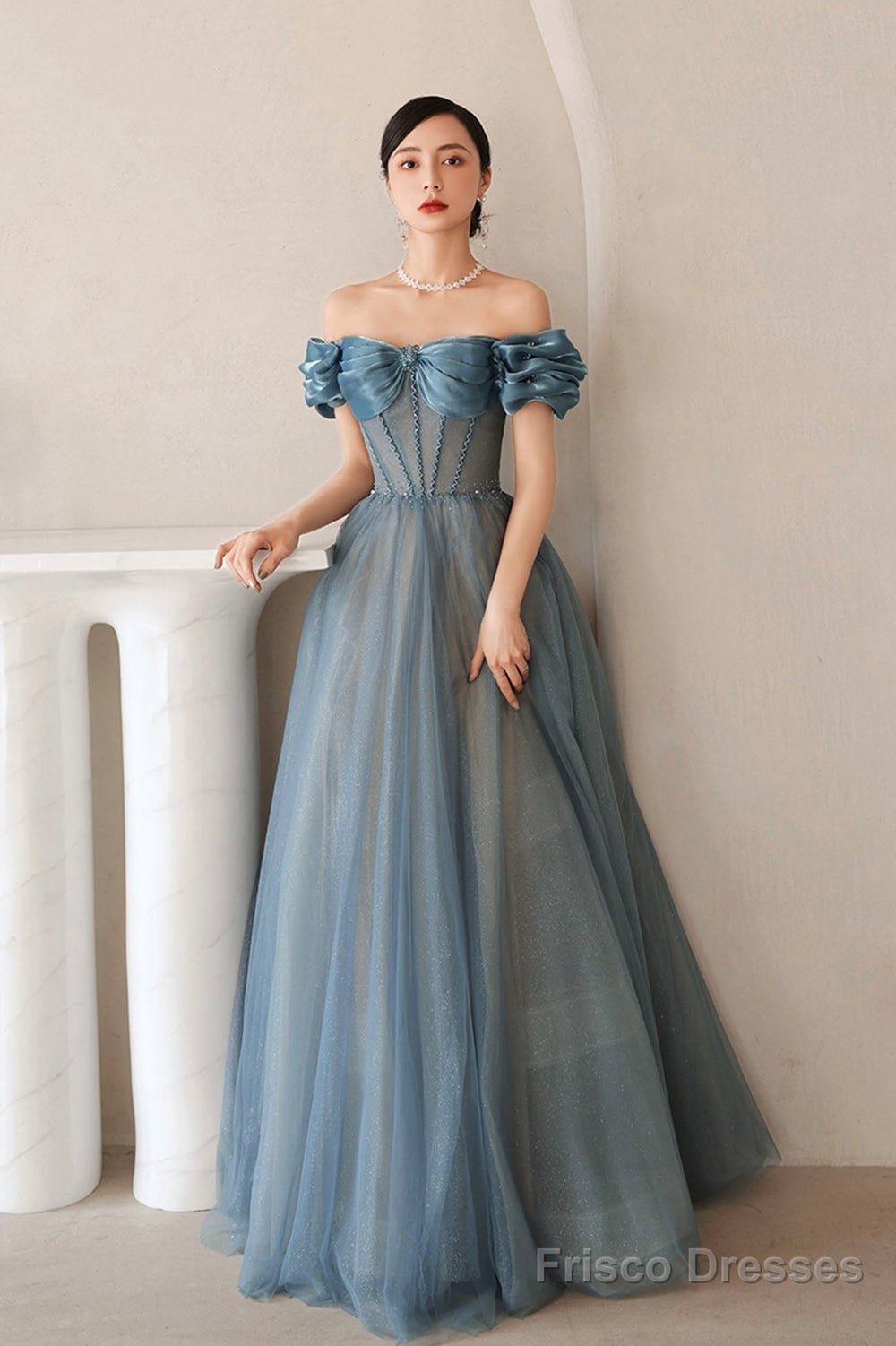 Blue Tulle Long A-Line Prom Dress, Elegant Off The Shoulder Formal Evening Dress