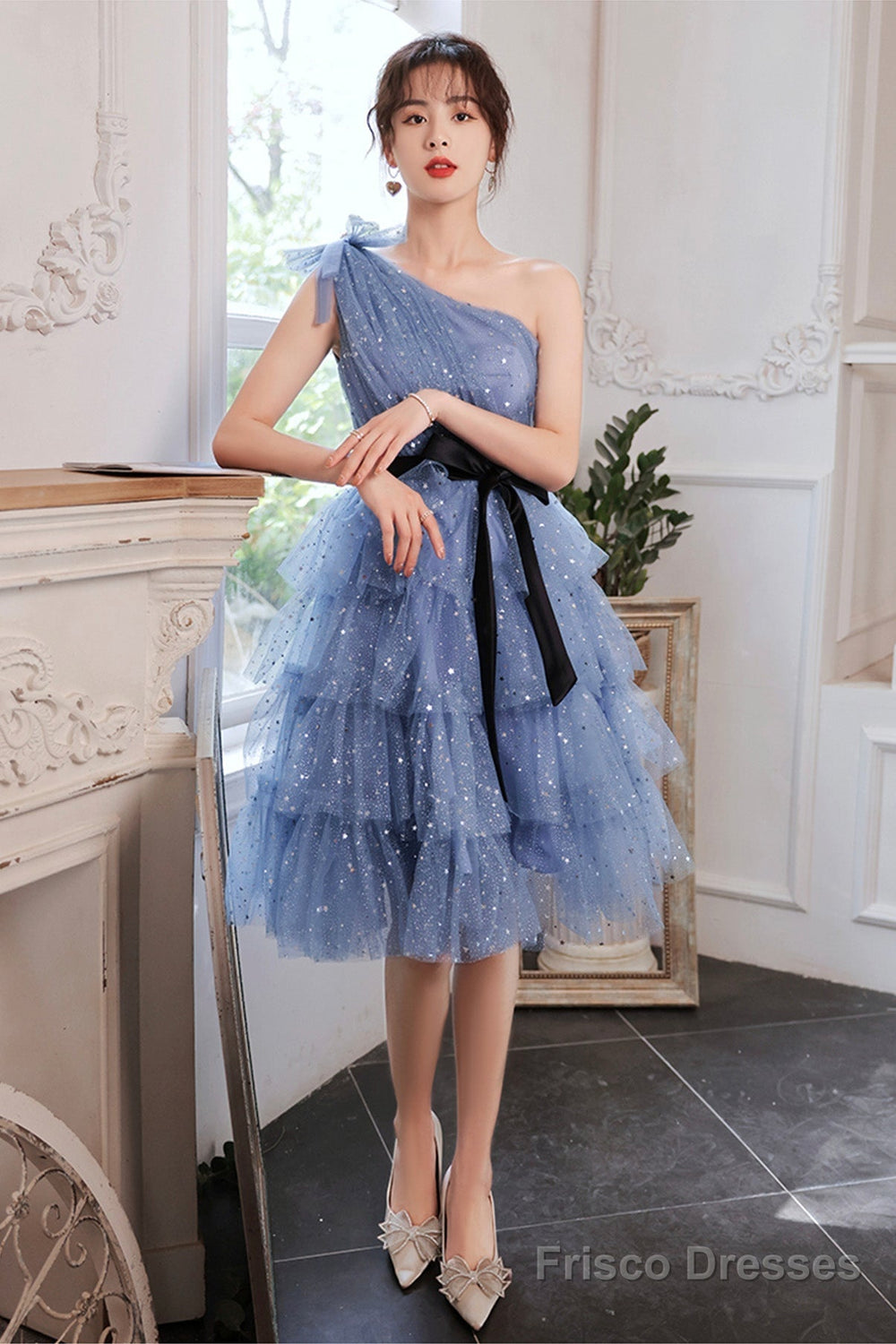Blue Tulle Short Prom Dresses, One Shoulder Evening Dresses