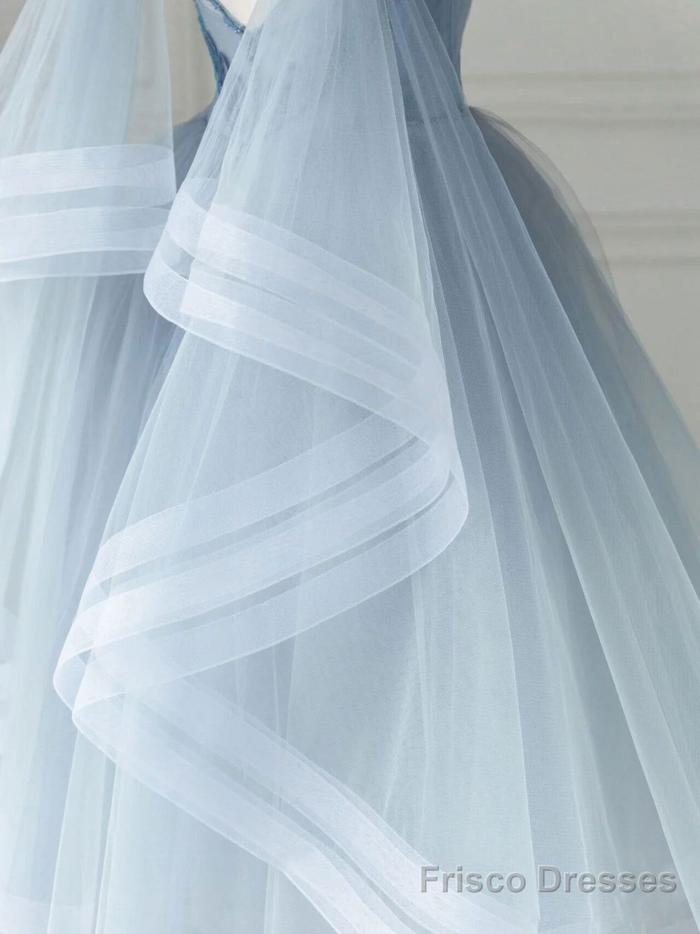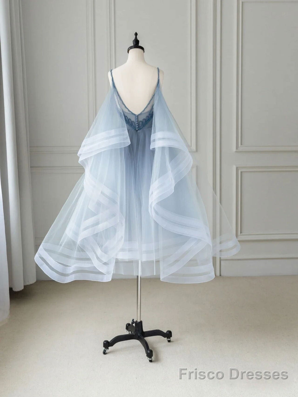 Blue V Neck Tulle Beads Short Prom Dress, Blue Tulle Formal Dress