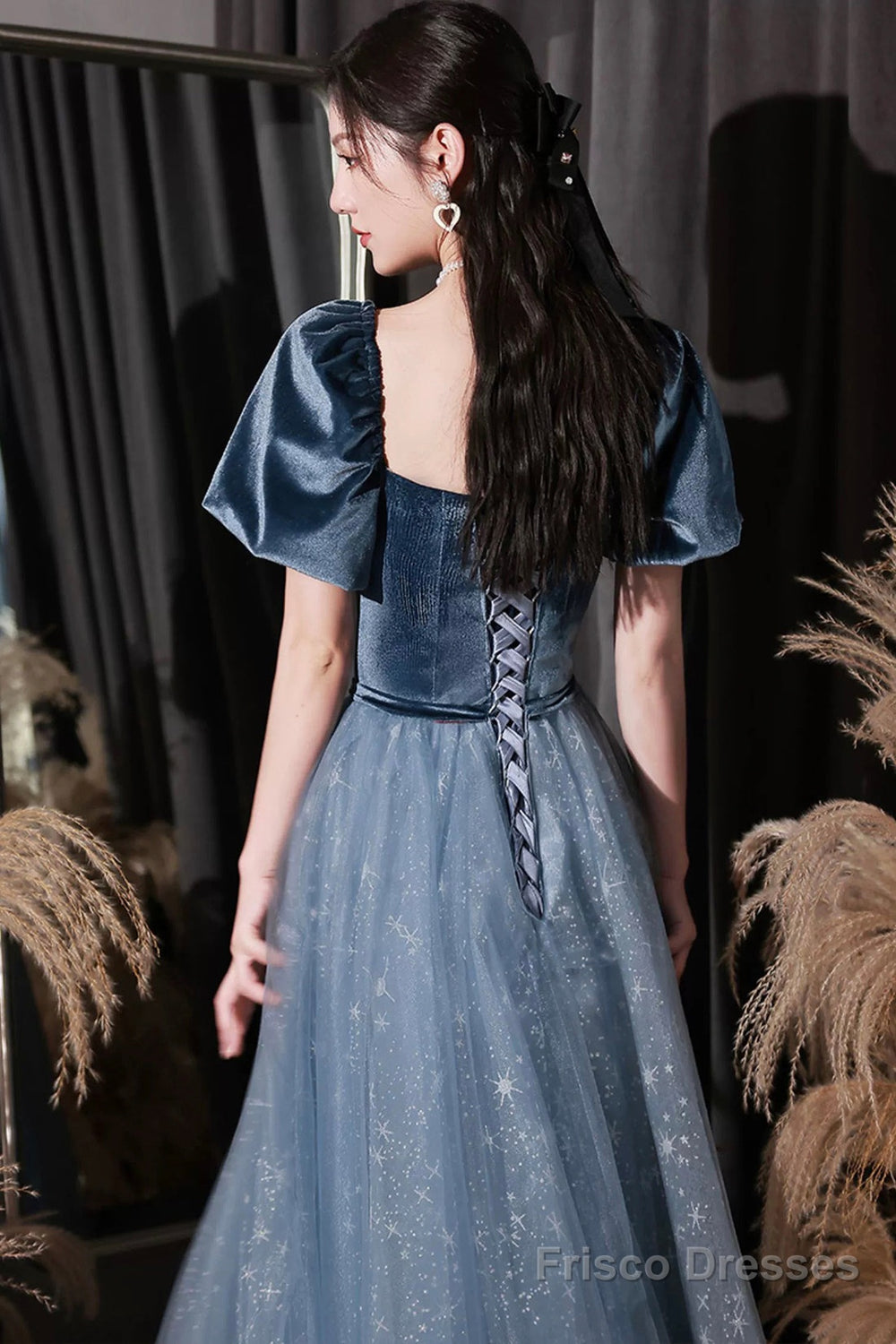 Blue Velvet Tulle Long Prom Dress, Beautiful Short Sleeve Evening Dress