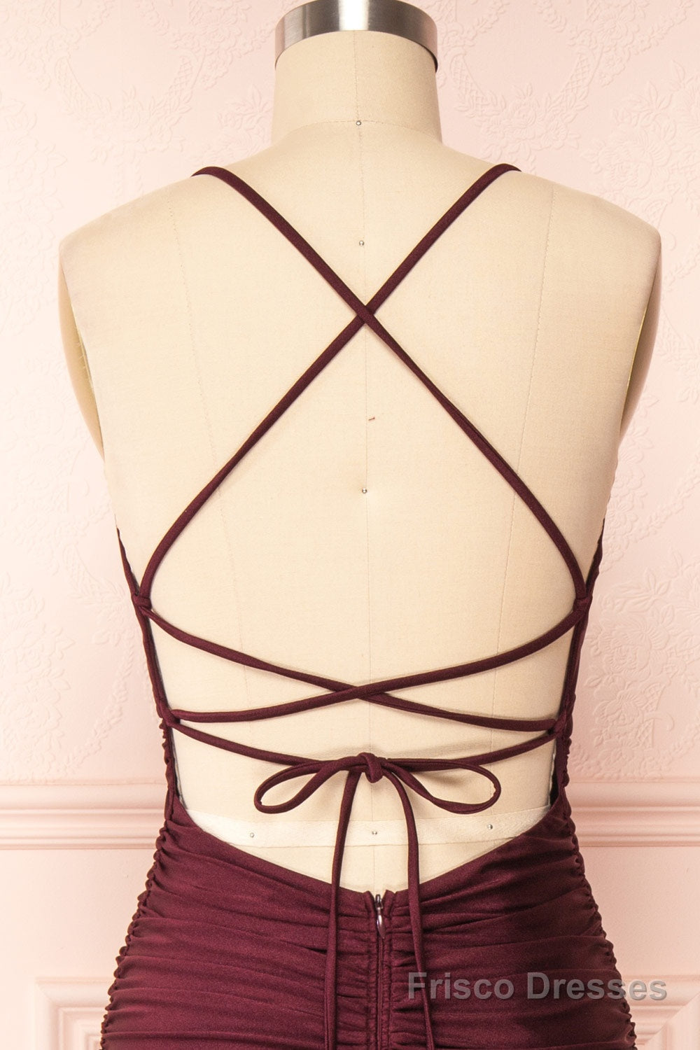 Burgundy Prom Dresses, Sheath/Column Scoop Neck Silk-like Satin Floor-length Ruffles Bridesmaid Dresses