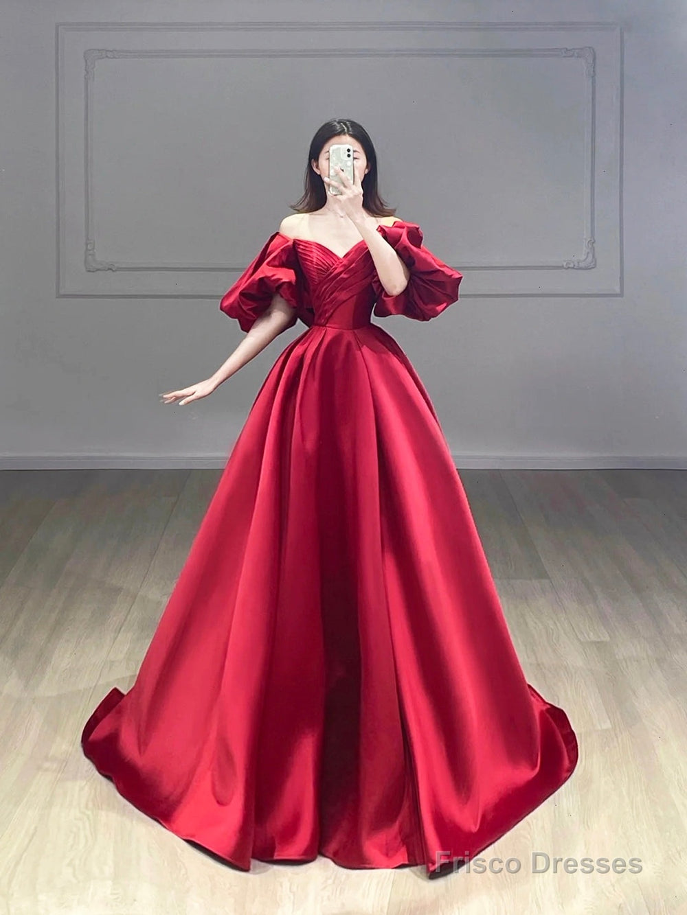 Burgundy Satin A-Line Prom Dress, Burgundy Puffy Short Sleeve Evening Dress