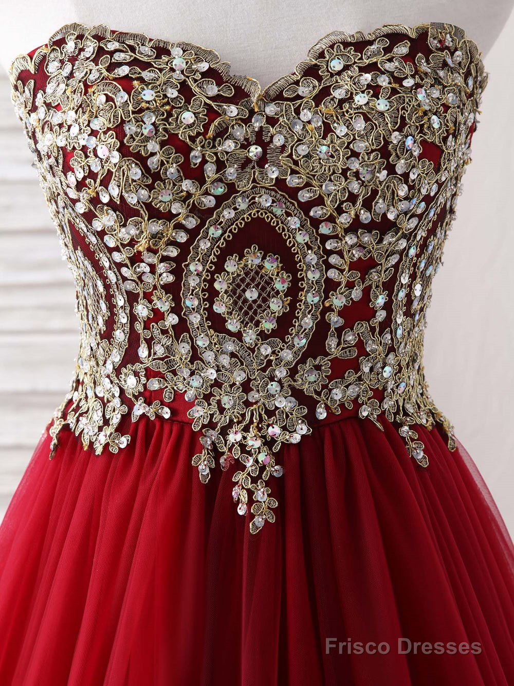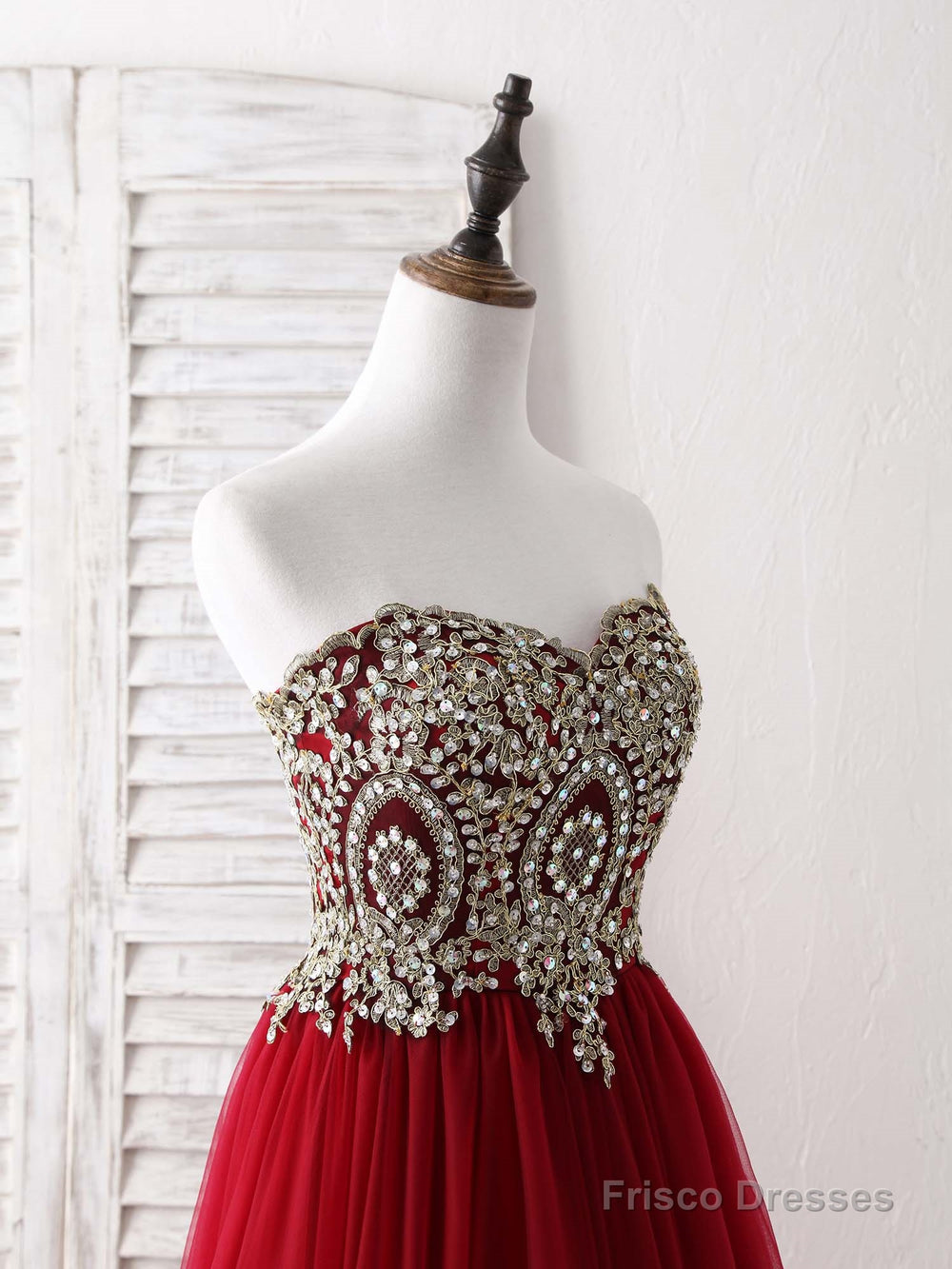 Burgundy Sweetheart Neck Lace Applique Tulle Long Prom Dresses