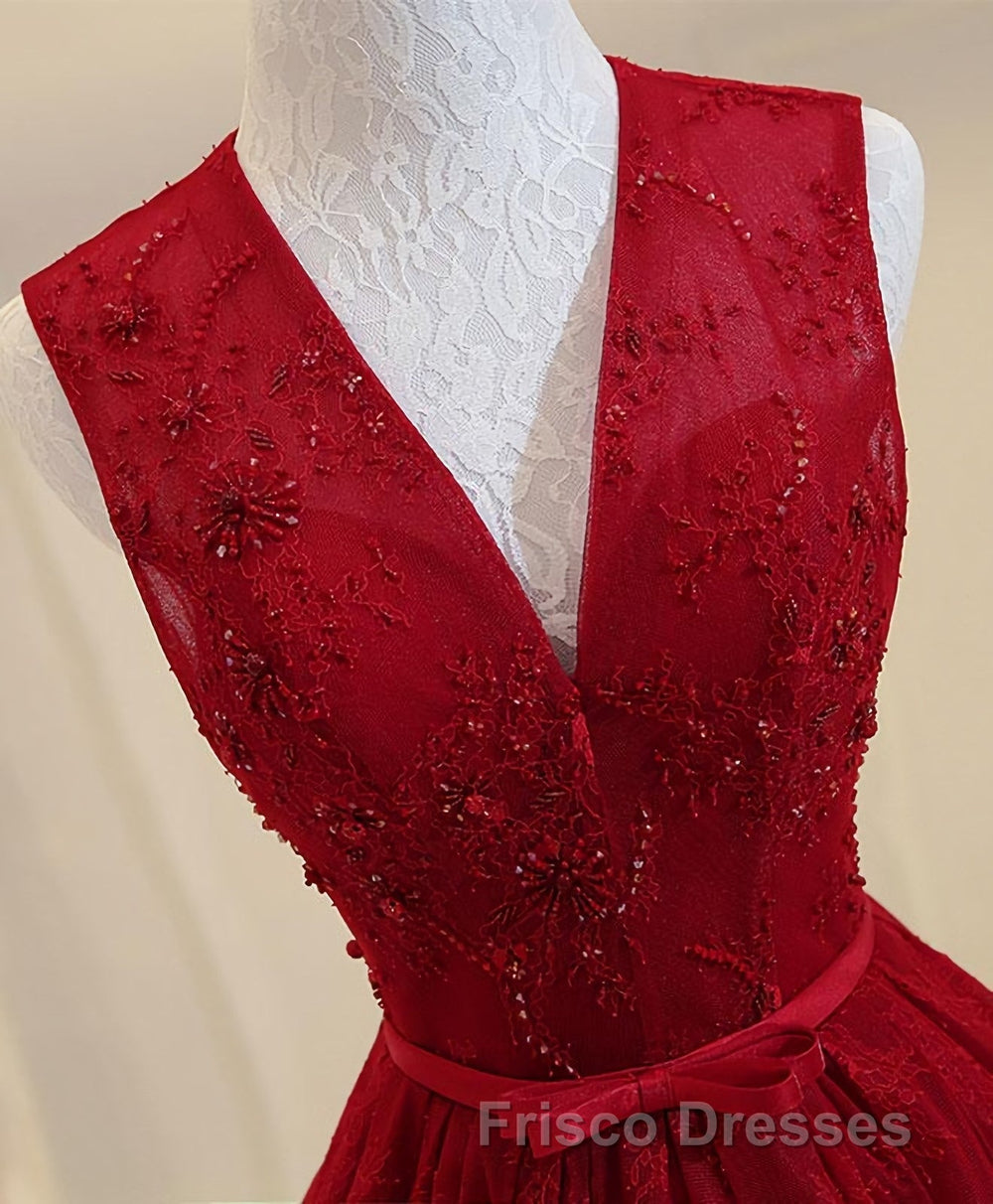 Burgundy V Neck Lace Long Formal Prom Dress, Burgundy Evening Dress