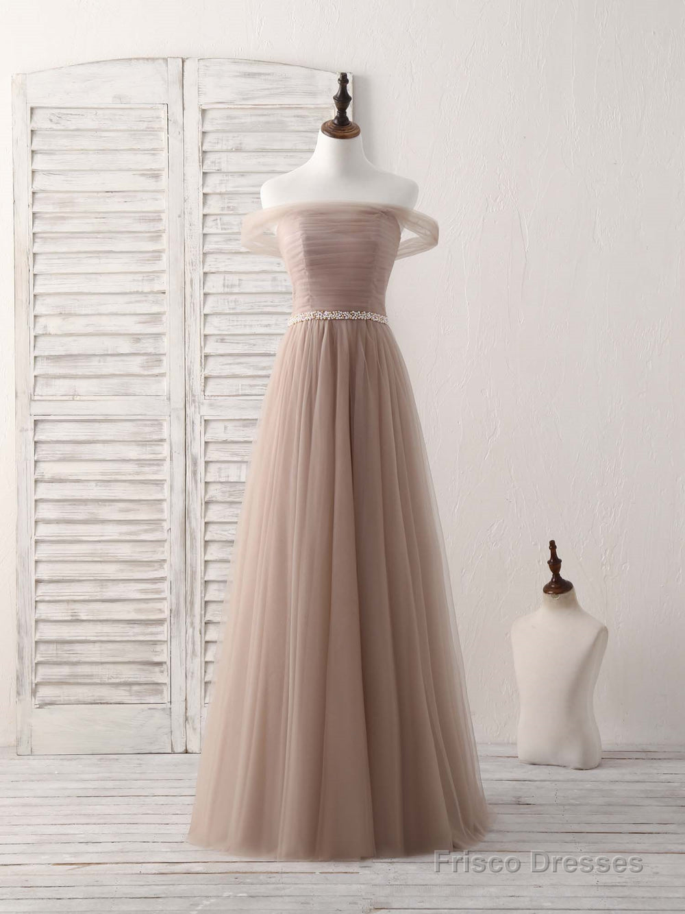 Champagne Off Shoulder Tulle Long Prom Dress, Champagne Evening Dress