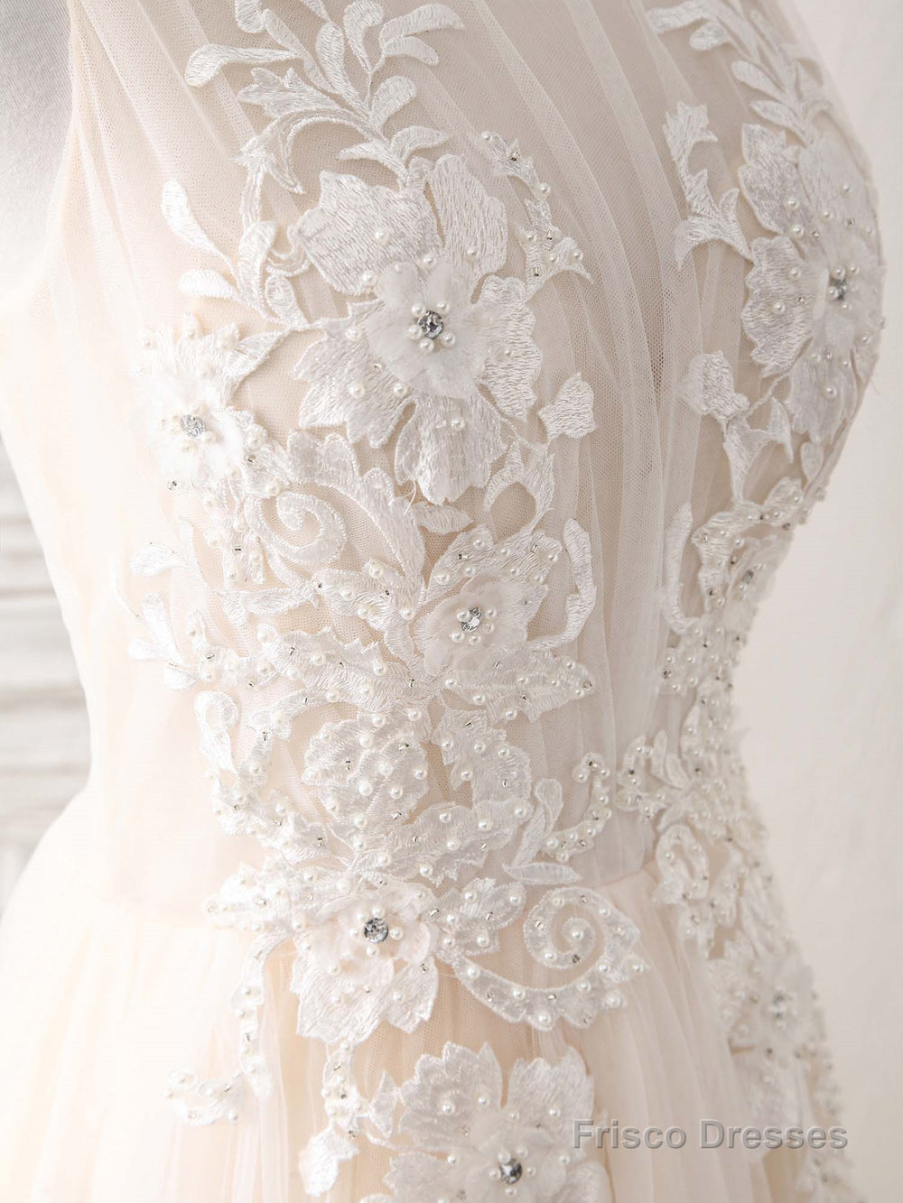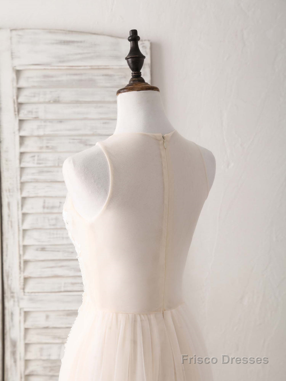 Champagne Round Neck Tulle Lace Applique Long Prom Dress