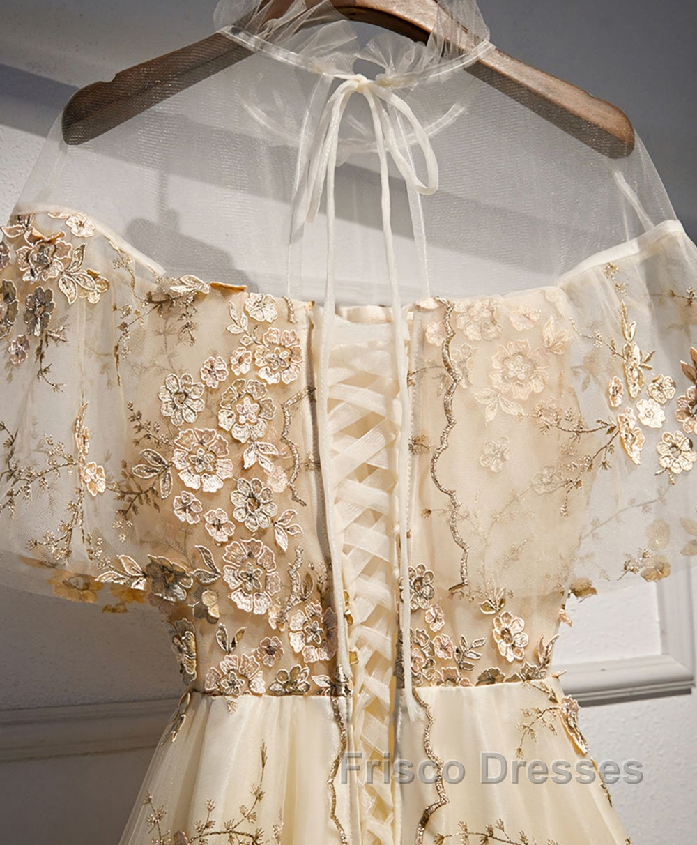 Champagne Tulle Lace Long Formal Prom Dress, Champagne Formal Dress, 1