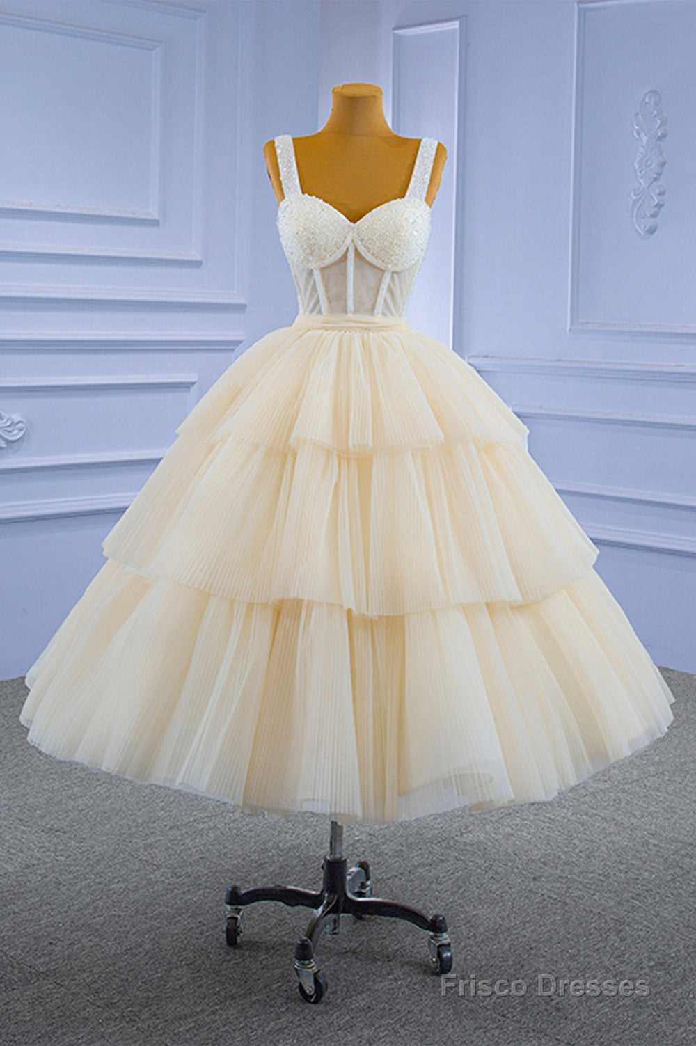 Champagne Tulle Short Prom Dress with Beaded, A-Line Tea Length Party Dress