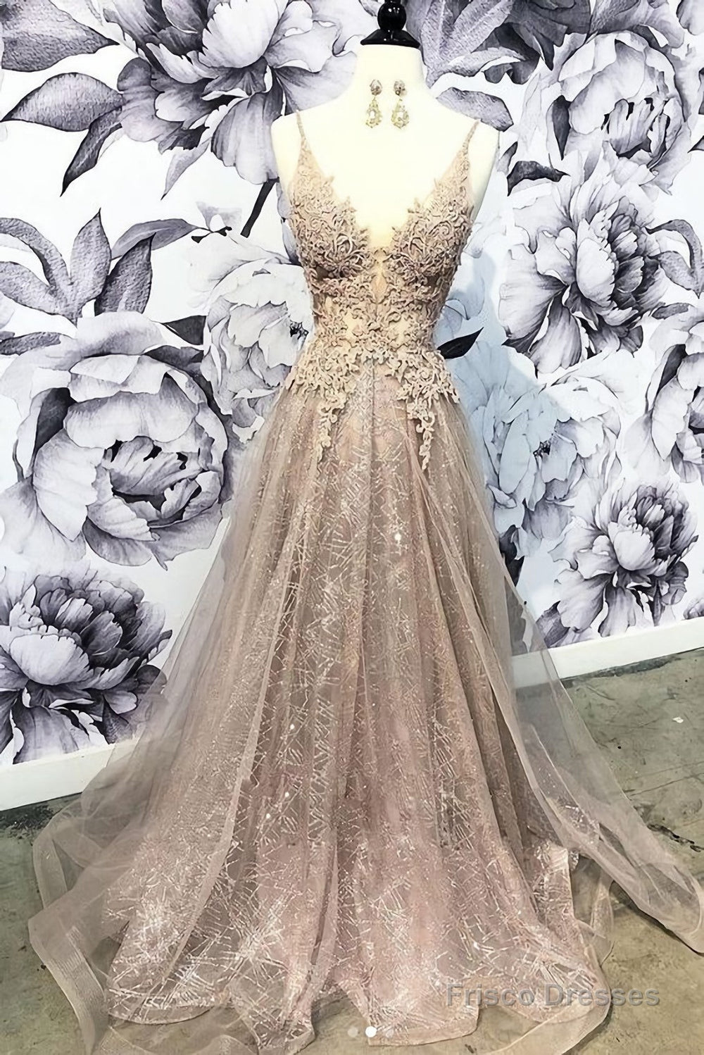 Champagne V Neck Tulle Lace Long Prom Dress, Champagne Tulle Evening Dress