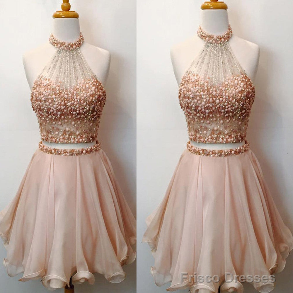 Charming Two Pieces Bare-Midriff Rhinestones Sparkly Halter Pink Cute Homecoming Dresses
